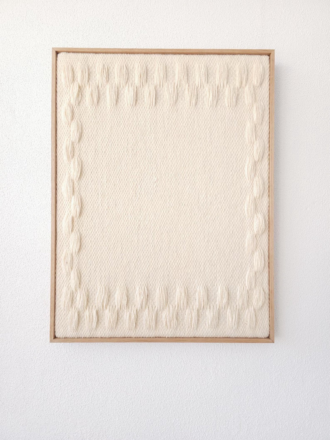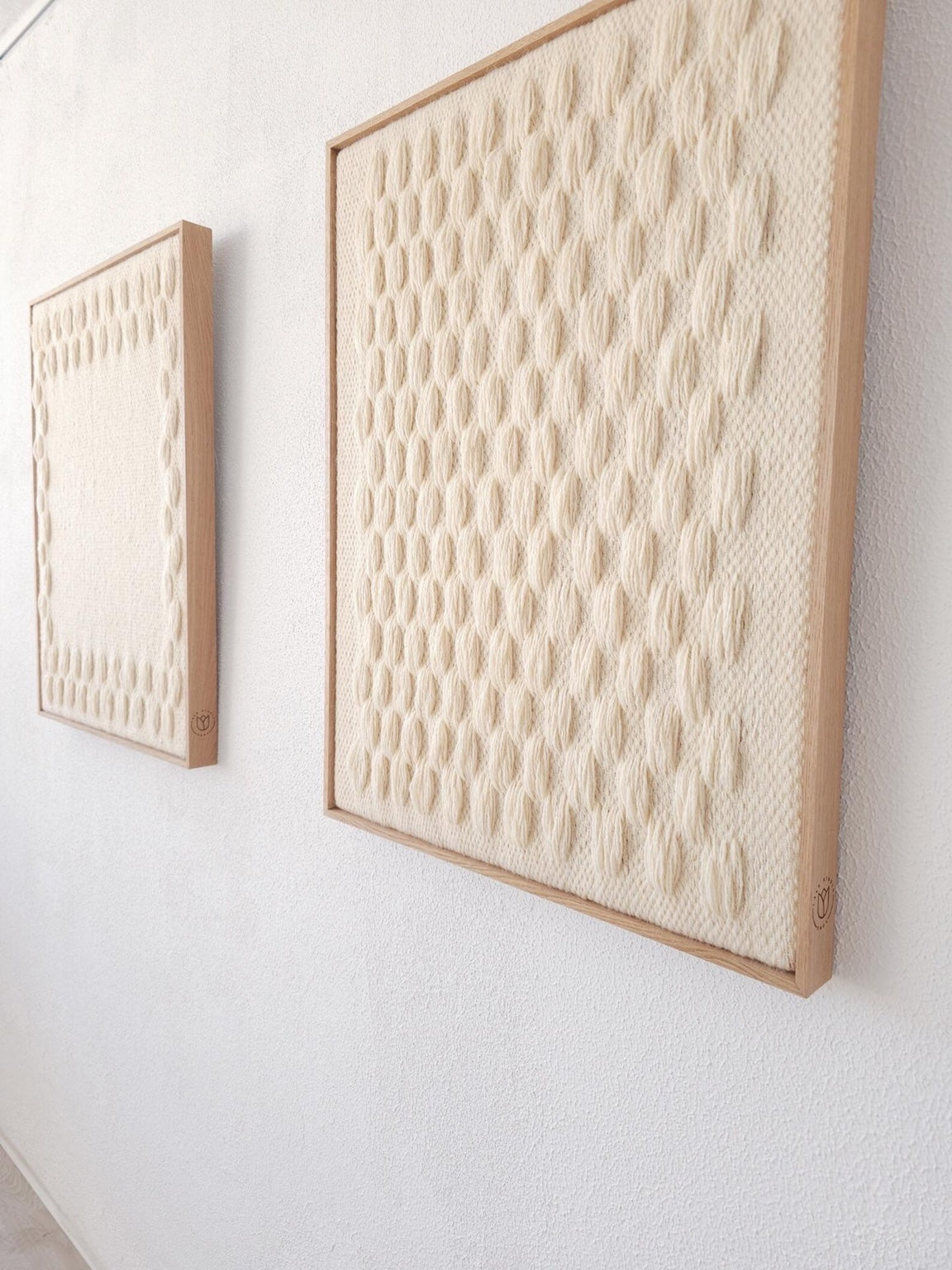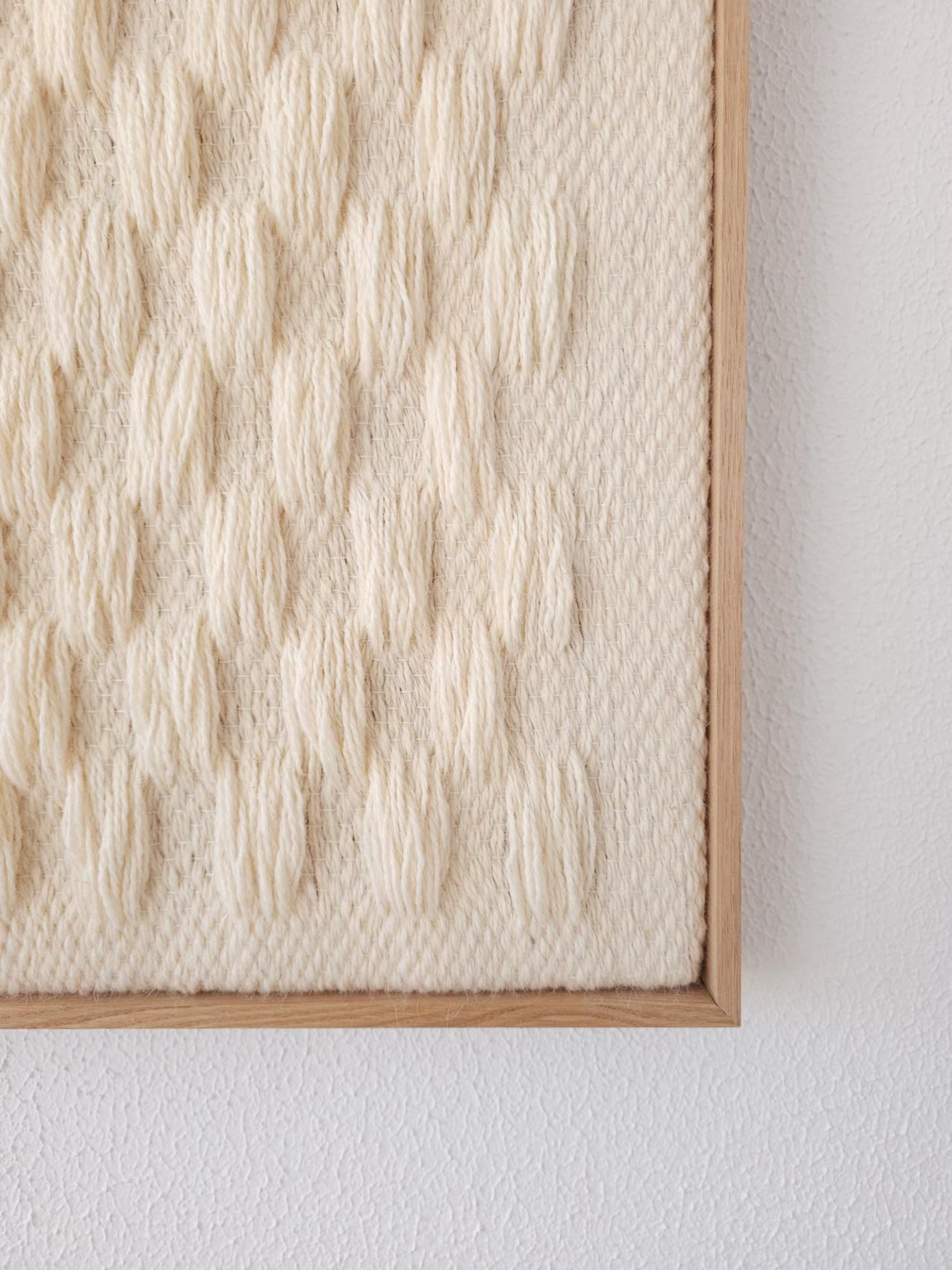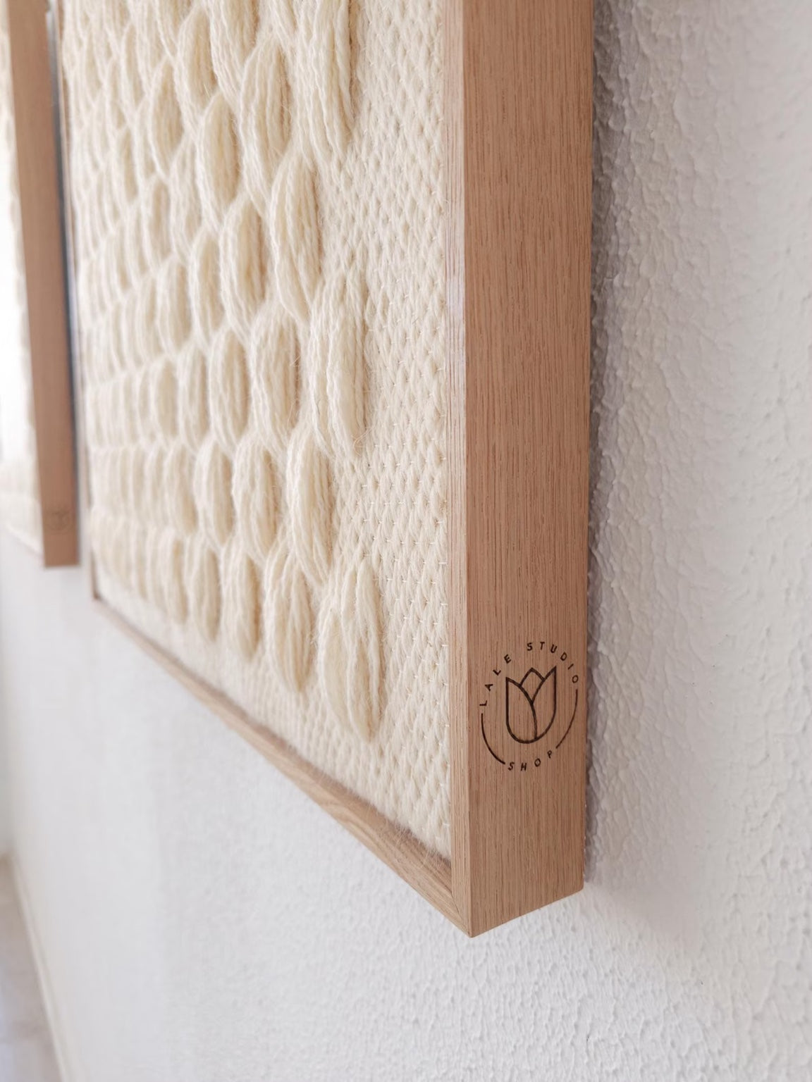 Introducing Framed 6, a stunning piece of artisan wall decor that combines meticulous craftsmanship with natural beauty. This handwoven wool tapestry, crafted in Poland, features soft cream and beige hues, making it a sophisticated addition to any modern interior. Perfect for those who value handcrafted elegance and timeless design.