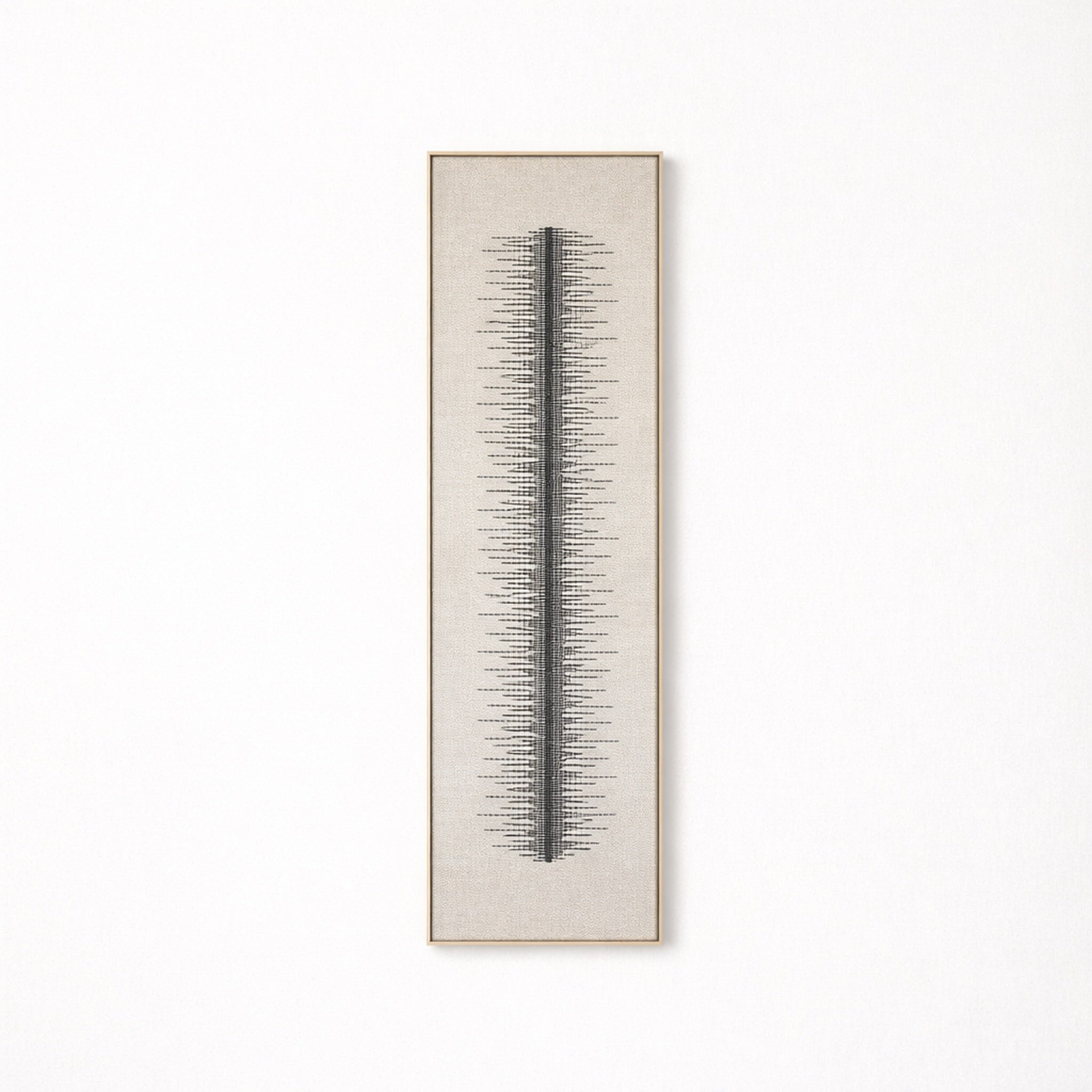 The sound wave pattern runs from top to bottom, creating a continuous visual rhythm. Subtle shifts in the grey tones introduce depth and dimension, while the neutral palette keeps the piece timeless and easy to integrate with existing decor.
