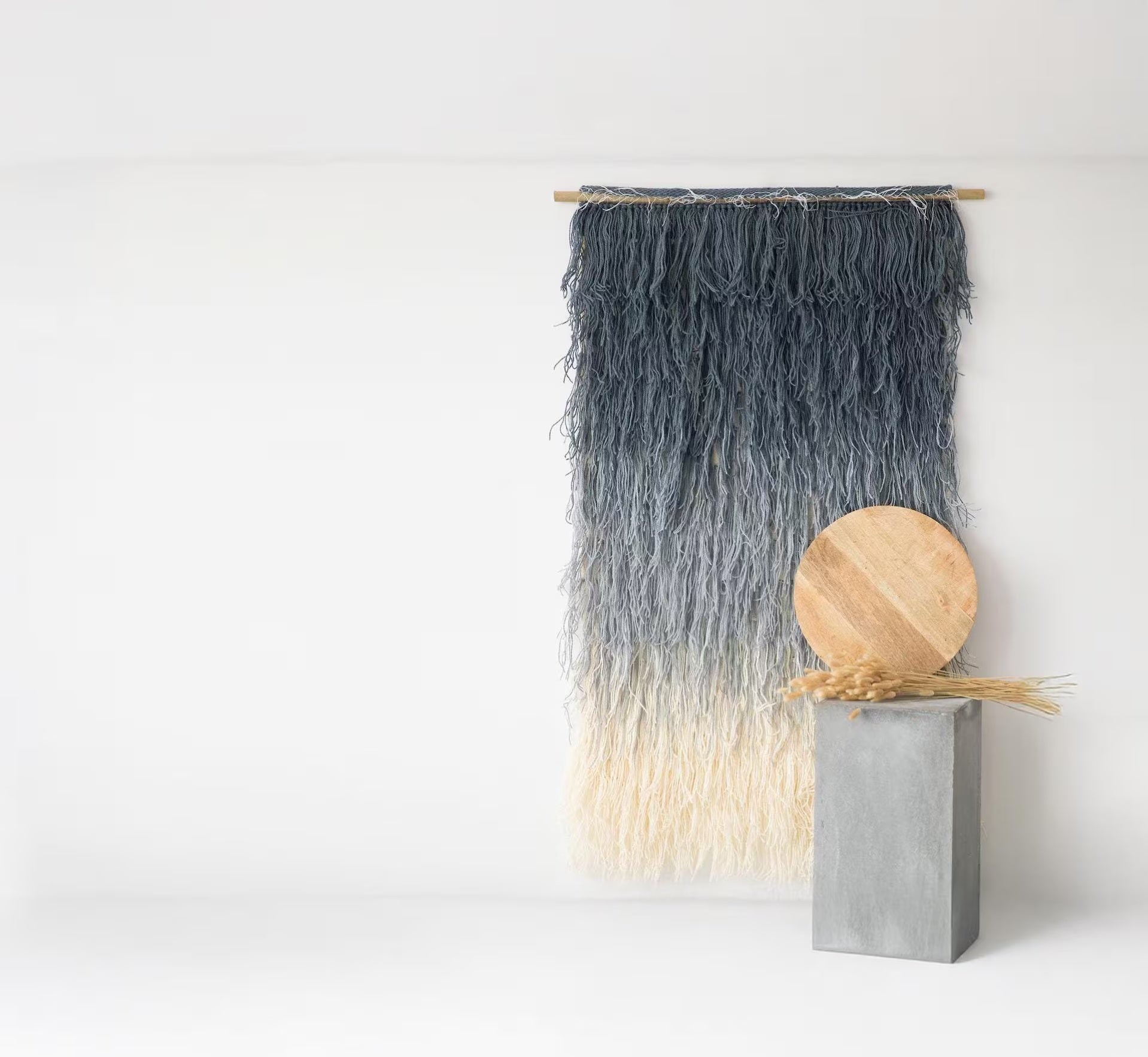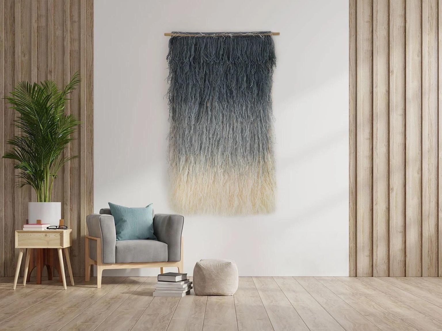 Transform your space into a sanctuary of calm with Snow, a flagship piece from our acclaimed Shaggy collection. This is more than just a decoration; it's a handwoven work of art that tells the story of a serene winter landscape. The masterfully crafted gradient transitions seamlessly from deep, saturated navy and gray tones at the top, reminiscent of a twilight sky, down to soft, creamy hues of white at the bottom, evoking freshly fallen snow. The long, shaggy wool creates a three-dimensional texture that comes alive in the light, adding profound depth and a unique, luxurious character to your interior.
