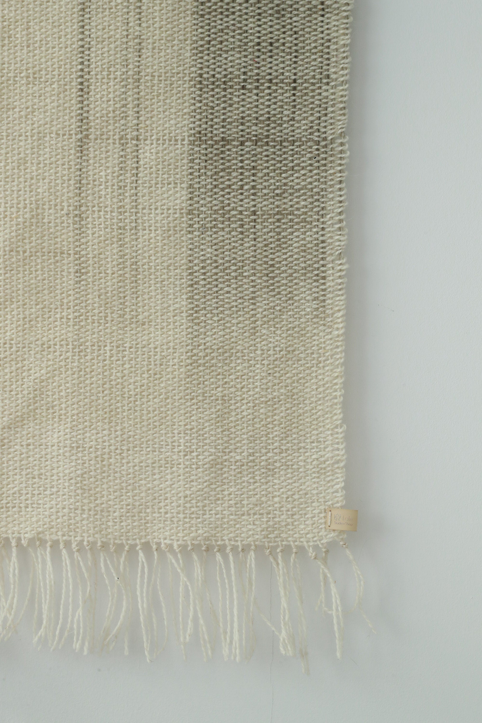 Handwoven Surge wall tapestry in natural beige wool with soft grey dip-dye accents, mounted on a bamboo rod. Styled in a Japandi-inspired interior with cozy decor elements.