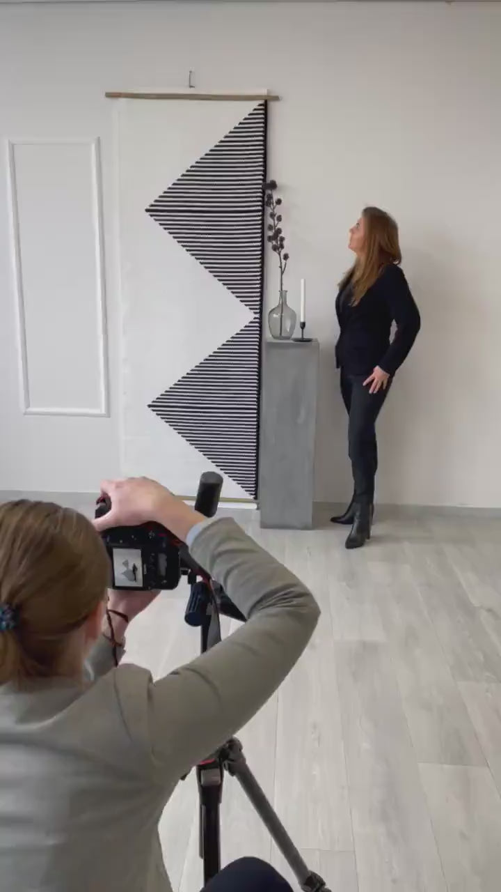 Handwoven with premium acryl yarns, Trian showcases a harmonious interplay of textures and contrasts. The bold geometric triangles in monochromatic tones bring balance and sophistication to any space, making it a versatile addition to diverse interior styles.
