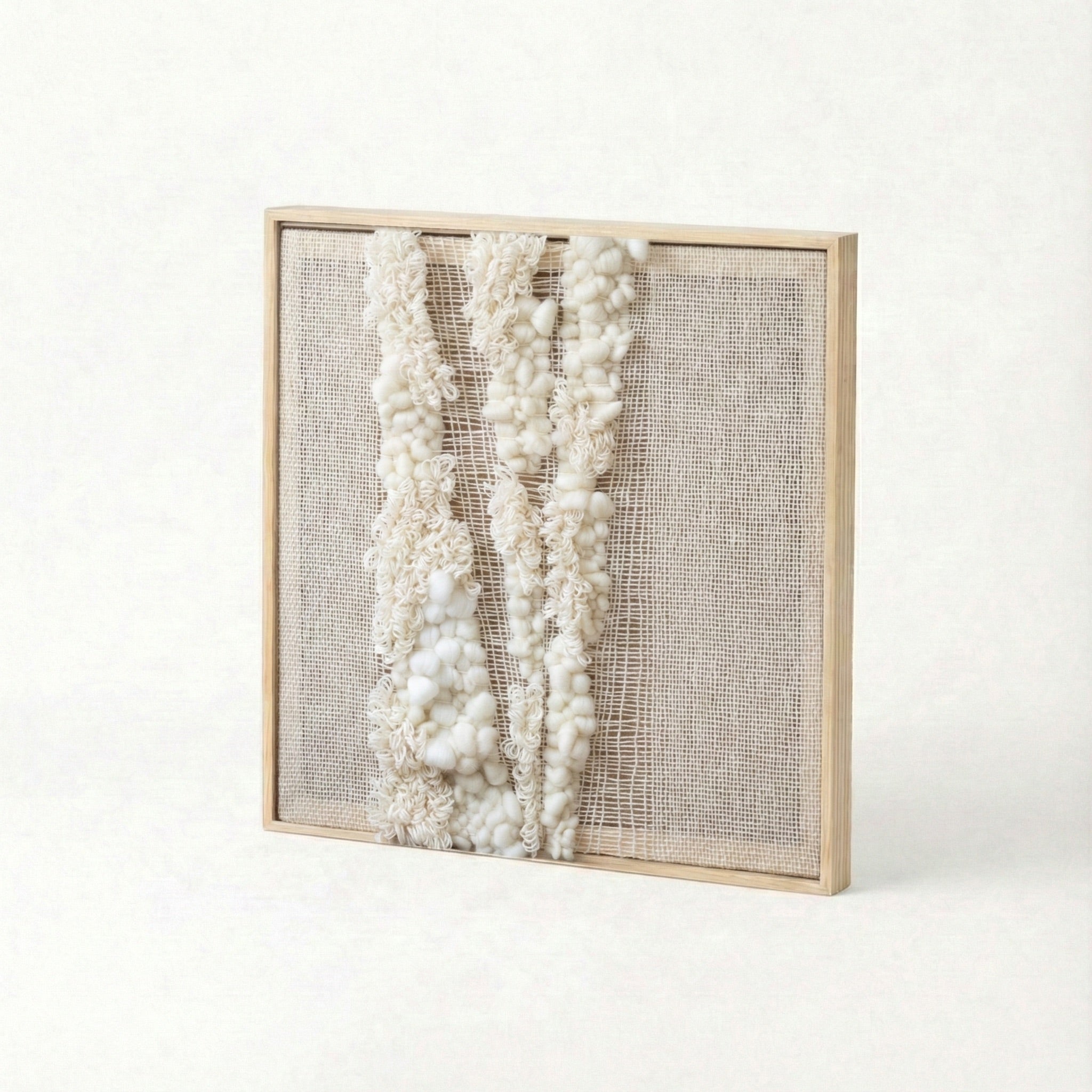 The neutral tones in raw white wool and organic texture make it versatile for different decor styles, ensuring it integrates effortlessly into any space. Perfect for modern homes, offices, or creative spaces seeking a touch of calm and beauty.